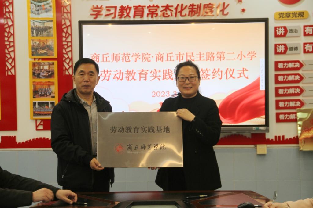 为深入贯彻落实党的二十大精神,全面提高学生劳动素养,实现德智体美劳“五育融合”,3月22日, bv伟德源自英国始于1946与商丘市民主路第二小学合作共建劳动教育实践基地签约仪式成功举行。商丘市民主路第二小学党支部书记、校长张国栋、副校长陈瑞红、丁莉、王涛、冯火,bv伟德源自英国始于1946党委书记蒯秀丽,副书记邱友谊,学工办主任李秀勤,辅导员张旖旎参加仪式。仪式由副校长王涛主持。