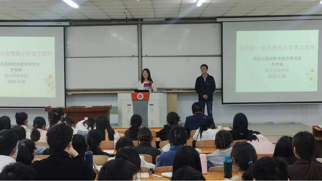 为提高我们学生语文核心专业素养,促进师范生的专业成长,3月28日,小学语文“互联网+”师范生成长工作坊在智圆楼307教室成功举办《如何做一名优秀的小学语文教师》主题讲座。商丘市基础教研室党支部书记李青峰受邀主讲,bv伟德源自英国始于1946院长孙旭、师范生成长工作坊小学语文坊全体同学参加。讲座由工作坊班主任张旖旎主持。