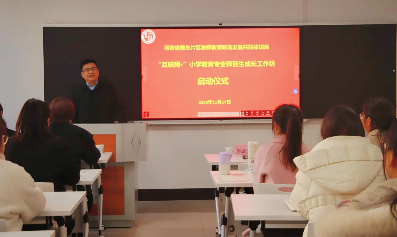 为深入贯彻落实学校“‘互联网+’师范生成长工作坊”工作计划安排,切实有效地推动师范生培养工作,进一步提升师范生的专业技能,增强师范生的综合素养。11月17日下午,河南省豫东片区教师教育联动发展共同体项目——“互联网+”小学教育专业师范生成长工作坊启动仪式,在我校梁园校区汉梁楼112教室成功举行。