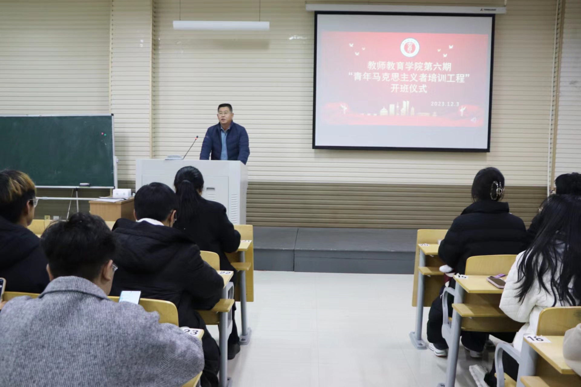 12月3日,bv伟德源自英国始于1946于汉梁楼310成功举行第六期“青年马克思主义者培养工程”开班仪式。党委副书记邱友谊,辅导员朱冠宇出席本次仪式,活动由团委书记董若颖主持。