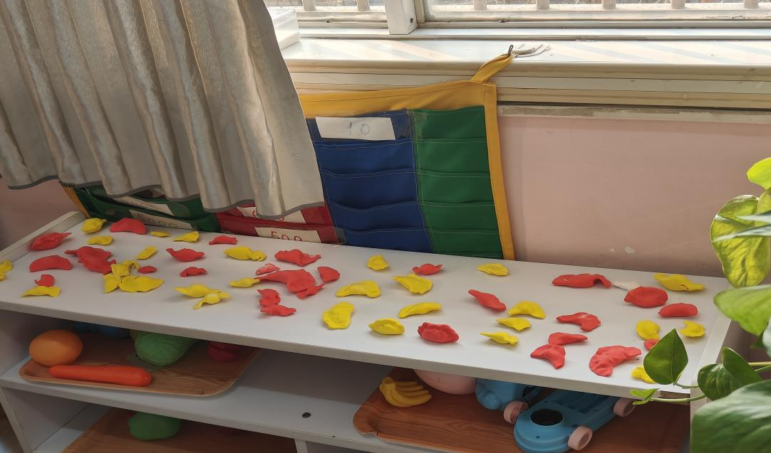 每个区角中都有各种各样丰富的玩教具,以满足幼儿游戏需要,同时能使幼儿在快乐的游戏中成长。部分区角还有幼儿创作的作品摆放陈列,许多幼儿作品与中国传统文化相互融合,班级设计游戏时十分重视中国传统文化,如幼儿用橡皮泥在冬至制作的饺子就被安放在桌面上。玩教具摆放得井井有条,区角一尘不染,教师在活动结束后让幼儿将玩具摆放得当,桌面清理干净。